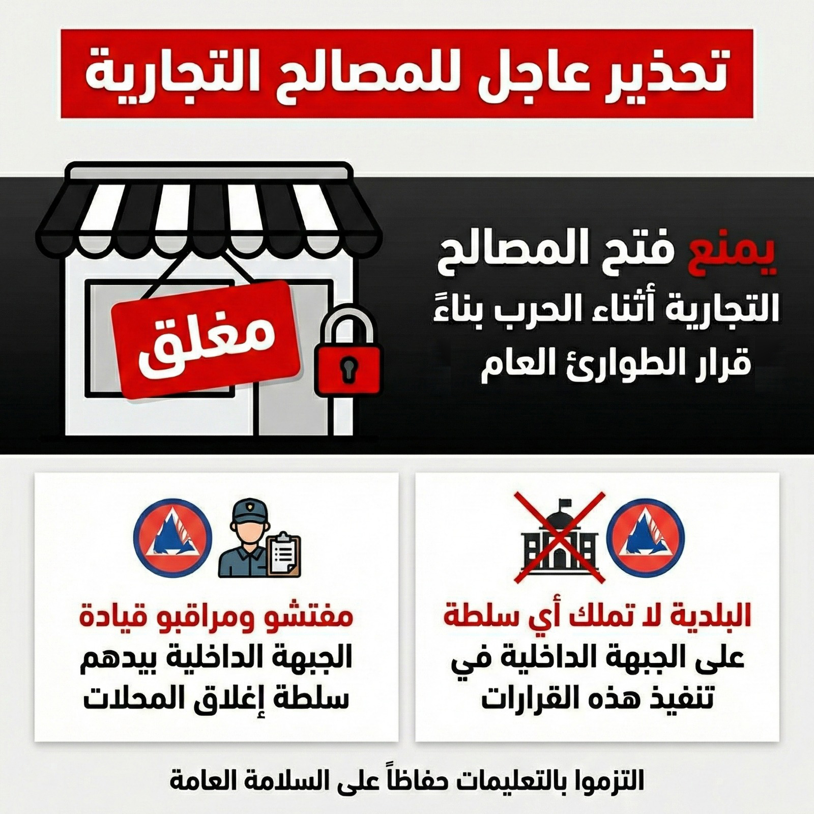يُحظر فتح أي منشأة تجارية، باستثناء المنشآت الأساسية المحددة في الأمر الصادر بتاريخ 27/1/2026. ولتسهيل الأمر عليكم، تجدون الأمر مرفقًا: